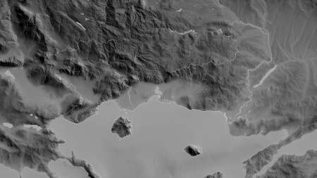 Eastern Macedonia and Thrace, decentralized administration of Greece. Grayscaled map with lakes and rivers. Shape outlined against its country area. 3D rendering