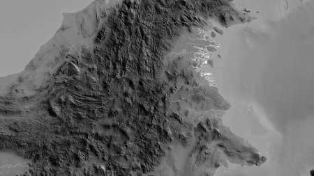 Golestan, province of Iran. Grayscaled map with lakes and rivers. Shape outlined against its country area. 3D rendering