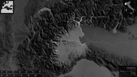 Piemonte, region of Italy. Grayscaled map with lakes and rivers. Shape presented against its country area with informative overlays. 3D rendering