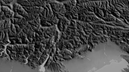 Trentino-Alto Adige, autonomous region of Italy. Grayscaled map with lakes and rivers. Shape outlined against its country area. 3D rendering