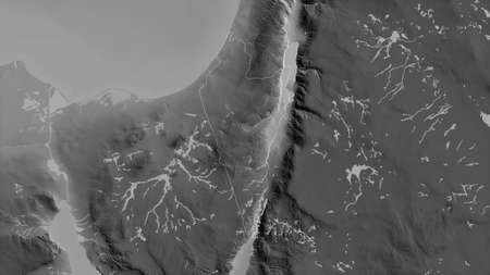 HaDarom, district of Israel. Grayscaled map with lakes and rivers. Shape outlined against its country area. 3D rendering