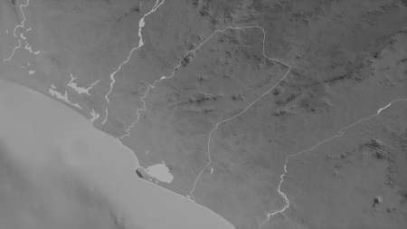 Grand Cape Mount, county of Liberia. Grayscaled map with lakes and rivers. Shape outlined against its country area. 3D rendering