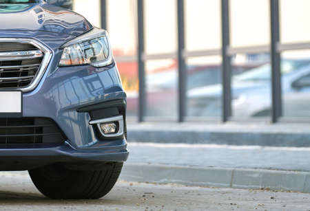 Close up of modern sedan headlamp. Front view shot from side of vehicle. Car headlight background.
