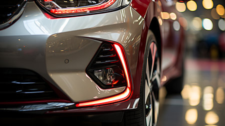Close-up view of a modern car's front bumper, highlighting the carbon fiber texture and glossy finish. The lighting accentuates the details and reflections.