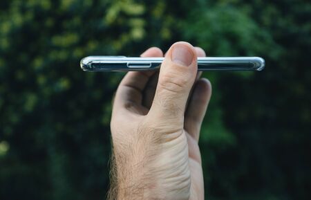 Paris, France - Oct 4, 2019: Man hand holding against green park background the new thin side view of Apple Computers iPhone 11 Pro with Clear protection case