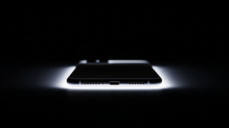 A modern smartphone lies flat on a dark surface, its edges subtly illuminated with a white glow.