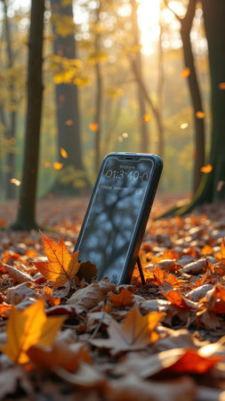 Smartphone in autumn forest with sunlight and falling leaves. That the image is generated using AI.