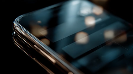 Close-up view of a modern smartphone screen reflecting warm light at night