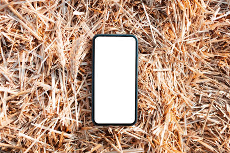 Close-up of smartphone with mockup on background of dry wheat.
