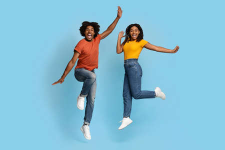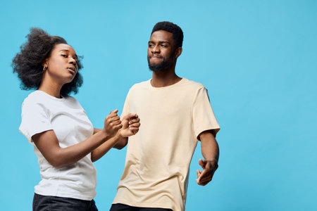 Young couple dancing joyfully against a light blue background, showcasing carefree emotions and stylish casual attire, perfect for celebration concepts