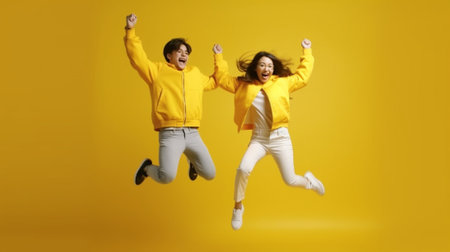 Generative AI : couple of young emotional people man and woman jumping on yellow background