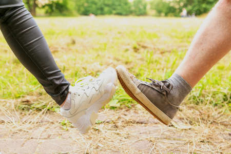 Beautiful couple in love standing outside in the nature and touching each other feet