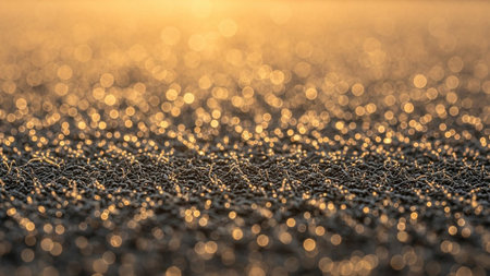 Macro view of a textured surface covered in frost or ice crystals, illuminated by golden sunlight creating bokeh.
