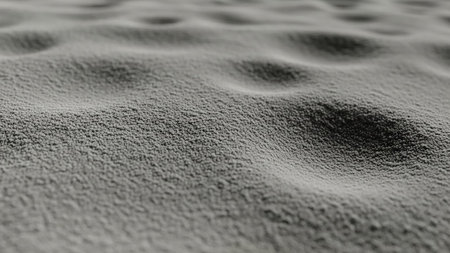 Macro view of textured grey sand with undulating waves and shadows creating a detailed surface.
