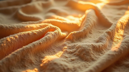 Warm sunlit fabric close-up with soft textures in golden light waves. That the image is generated using AI.