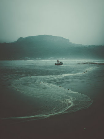 A lone boat drifts quietly on serene waters surrounded by a misty landscape with a distant mountain under soft morning light, creating a tranquil atmosphere.