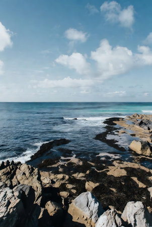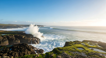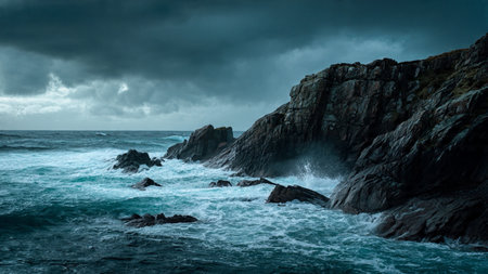 The rugged coastline is a symphony of crashing waves and jagged cliffs, where natures forces collide to create a breathtaking panorama of raw beauty.. AI generated.