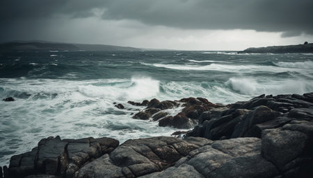 Breaking waves crash against rocky coastline beauty generated by artificial intelligence