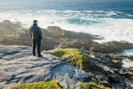 Tourist admiring scenic beauty of Malin Head, Ireland's northernmost point, Wild Atlantic Way, spectacular coastal route. Wonders of nature. Numerous Discovery Points. Co. Donegal
