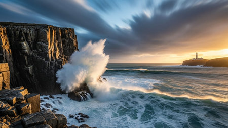 Dramatic waves crash against dark, textured rocks under a sky with motion-blurred clouds at sunset. A striped lighthouse stands on a distant cliff.