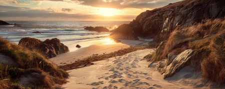 A tranquil coastal path at dawn background with gentle waves, soft sands, and the textures of rugged cliffs and serene surroundings, creating a peaceful and picturesque natural retreat.
