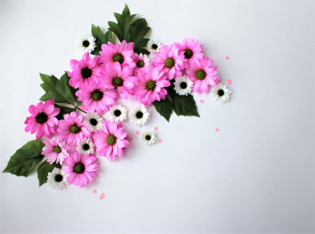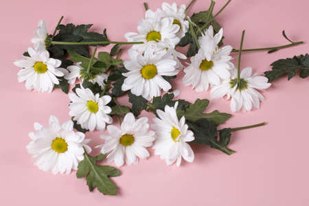 white chrysanthemum flowers chamomile on a pink surface in a large number of background blurred