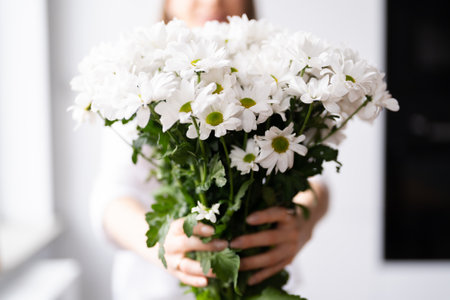 Young beautiful cute sweet lovely smiling woman with hold a bouquet of white fresh flowers at home