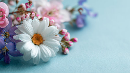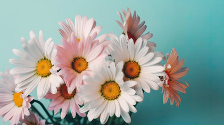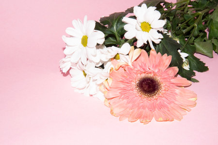 Fresh daisies on a pale pink background. Pastel pink background and light daisies with a yellow core. Large close-up daisies, copyspace.