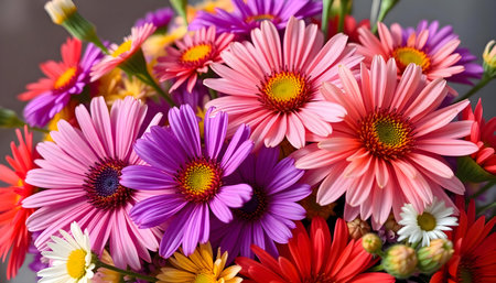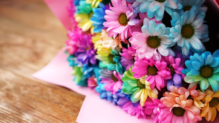 Close up blossom rainbow flowers bright bouquet on wooden background