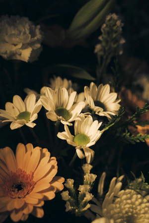 A bunch of white chrysanthemums. Incoming sunshine, spot of light on the flowers, moody atmosphere. Copy space.
