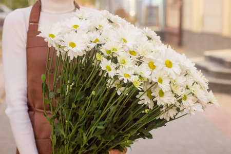 girl florist holding a bouquet of daisies.flower composition.sale of flowers in a flower shop.big bouquet with daisies in hands
