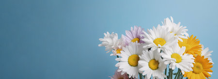 top shot of small chamomile flowers on right side of light blue textured paper, horizontal herbal template, space for text