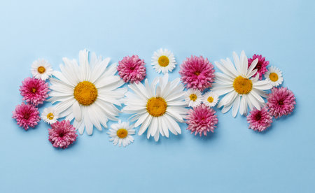 Assorted garden blossom flower heads on blue background with space for text. flat lay