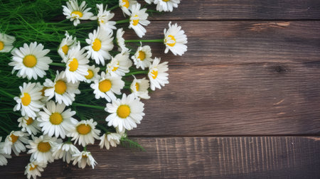 Fresh chamomiles flowers on brown wooden background. Free space for your text.