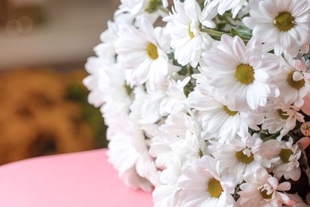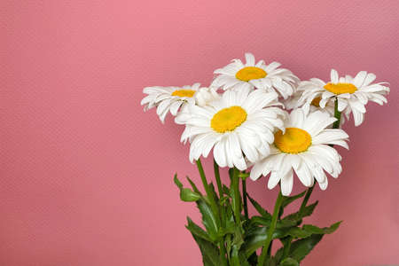 Bouquet of white daisy chamomile flowers on pink background as floral composition. copyspace. close up.