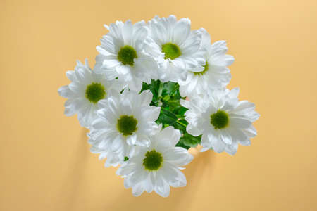 Beautiful bouquet of daisies on a yellow background. White chrysanthemum, top view. Beauty concept.