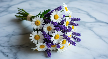 A rough piece of light pink stone with a natural grey pattern-cracks with bouquet of chamomile on it. Texture of slate, granite, rough wall