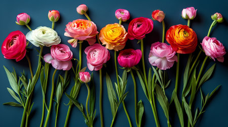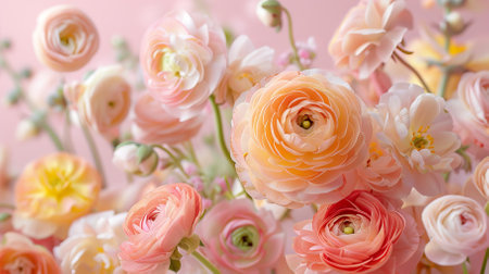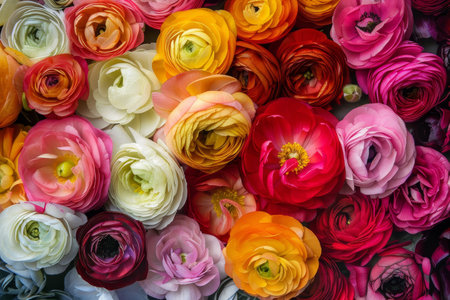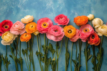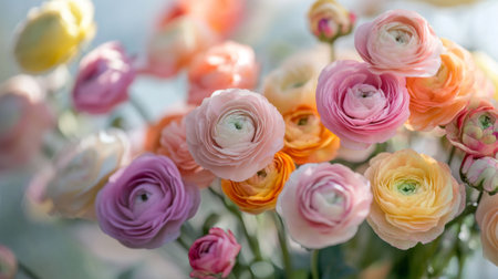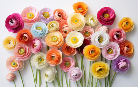 Colorful ranunculus flowers arranged on a light background