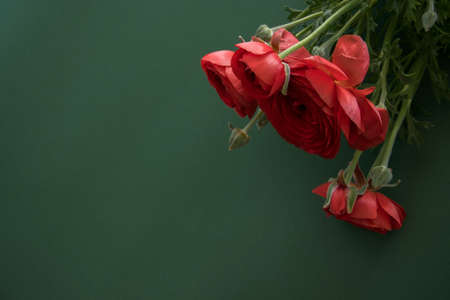 Bouquet of red ranunculus flowers on a rustic background. Close up. Top view