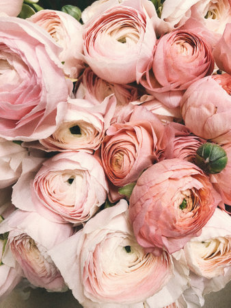 Pink persian buttercup. Bunch pale pink ranunculus flowers light background. Wallpaper, Vertical photo