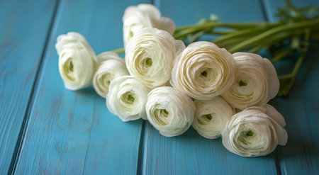A bouquet of elegant white ranunculus flowers stands upright, showing their intricate layers. They are set against a bright blue wooden backdrop, creating a striking contrast that enhances their delicate beauty.