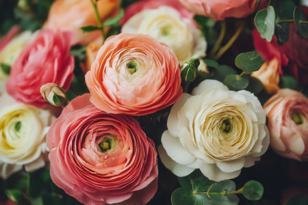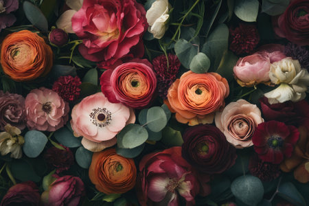 Pink roses, ranunculus, anemones, and eucalyptus leaves arrangement. Floral beauty and natural elegance