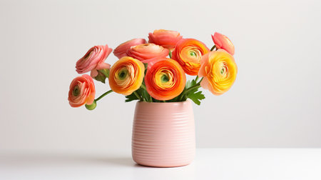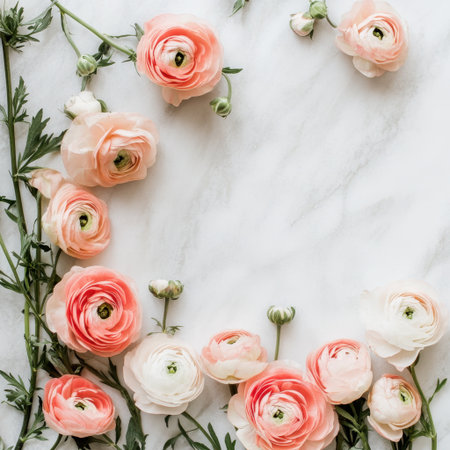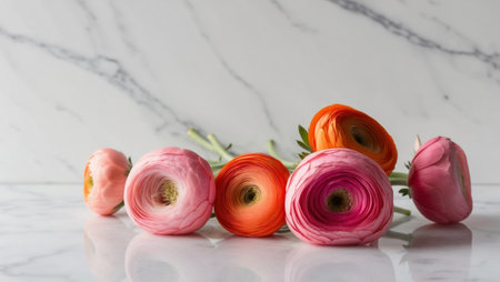 AI Generated. arrangement of pink and orange ranunculus flowers on a white marble background