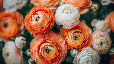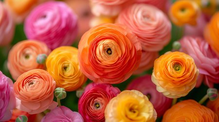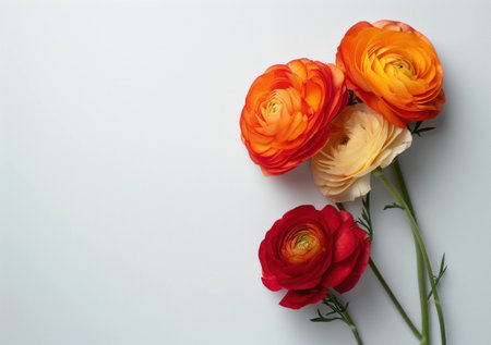Colorful ranunculus flowers arranged artistically on a light background, showcasing vibrant hues of orange, yellow, and red. Floral design and decoration concept.