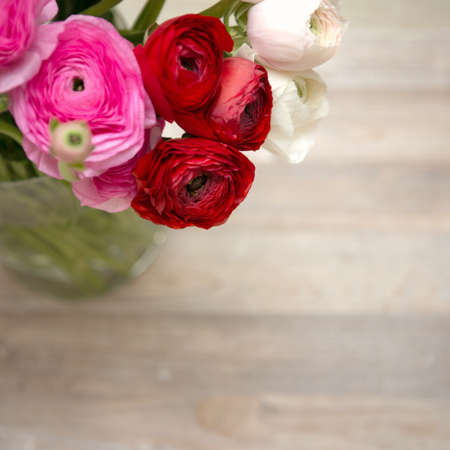 Bouquet of pink and white ranunculus flowers on wooden background