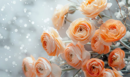 Pale orange ranunculus wreath in the snow on white marble background