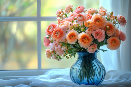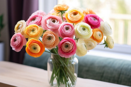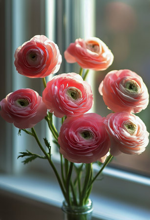 Bouquet of beautiful ranunculus flowers in vase on windowsill
