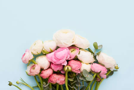 Bouquet of ranunculus flowers on a blue background. Mothers Day, Valentines Day, birthday concept