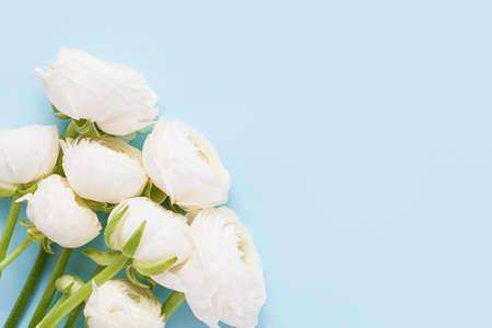 White ranunculus flowers bunch on blue background. Mothers Day, Valentines Day, birthday concept