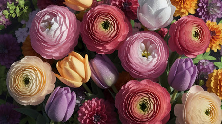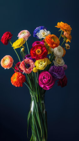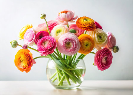 Colorful ranunculus flowers arranged elegantly on a light background, showcasing vibrant petals and delicate greenery. Perfect for spring and floral themes.